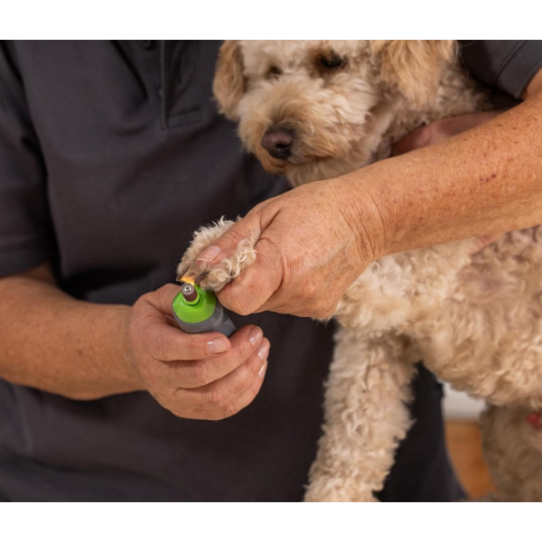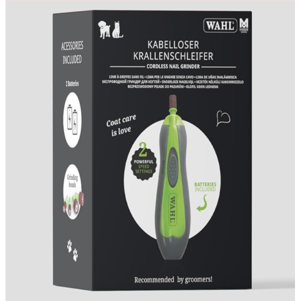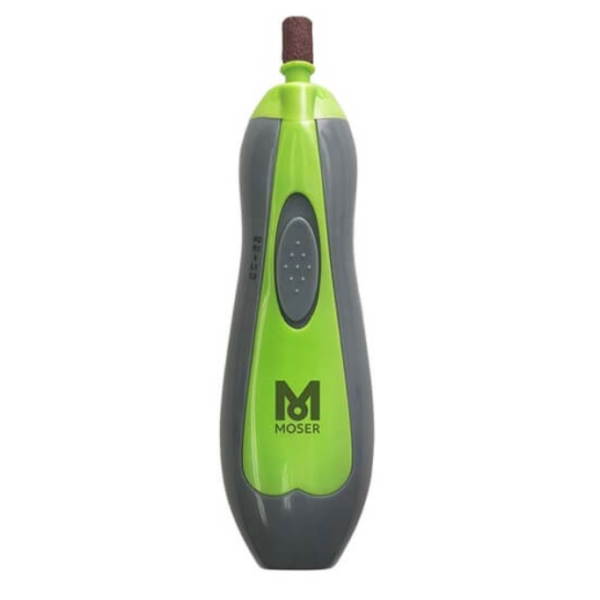 Moser Cordless Nail Grinder — беспроводной гриндер для животных, работающий от двух AA‑батареек. Оснащён четырьмя скоростями (2 вперёд и 2 назад), сверхтихим мотором, встроенным мини‑фонариком для безопасной обработки и лёгкой смены насадок. Предназначен для ухода за когтями собак, кошек, птиц и мелких животных.