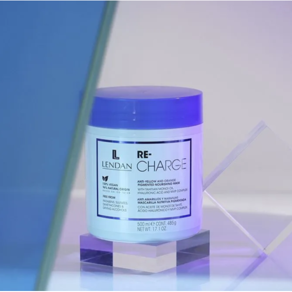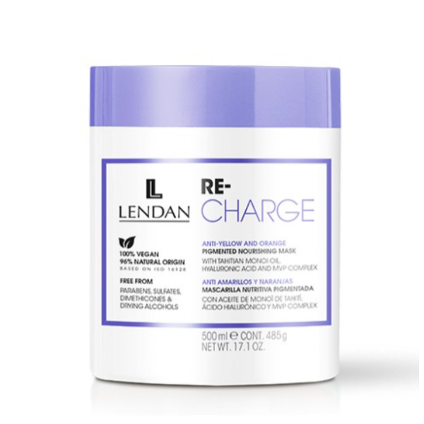 Интенсивно питающая маска Lendan Re‑Charge Anti‑Yellow & Orange (500 мл) предназначена для осветленных, мелированных и блондинированных волос. Формула содержит пигменты, которые нейтрализуют нежелательные жёлтые и оранжевые оттенки, укрепляет структуру волос с помощью растительного комплекса и обеспечивает глубокое увлажнение при помощи катионической гиалуроновой кислоты.