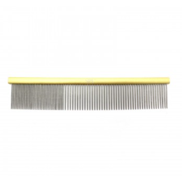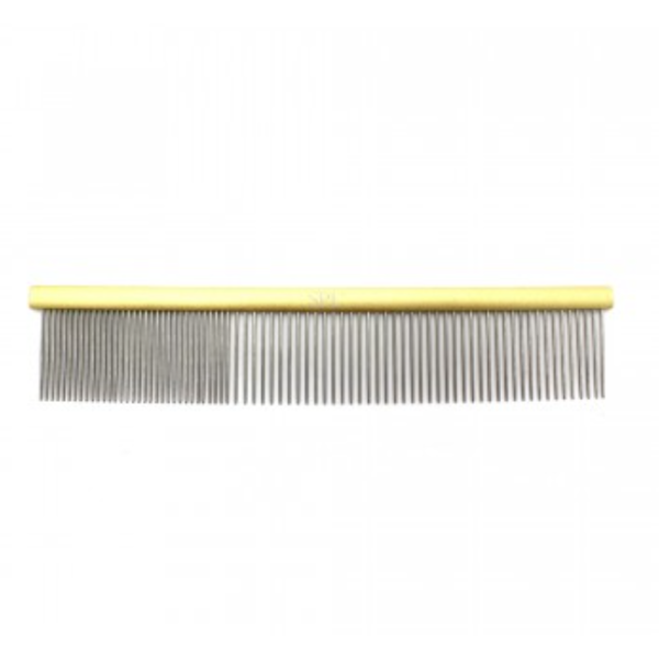 Комбинированный металлический гребень SPL — универсальный инструмент для груминга собак и кошек с длинной или средней шерстью. Оснащён двумя частотами зубцов — редкими и частыми — и изготовлен из высококачественного металла с полированными, закруглёнными зубцами, что обеспечивает бережное распутывание и комфортное расчесывание. Идеален для подготовки шерсти перед стрижкой, придания объёма и лёгкого ухода.