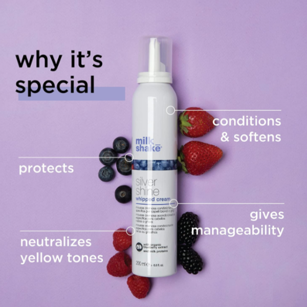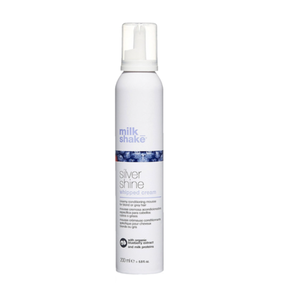 Silver Shine Whipped Cream Milk Shake — несмываемая крем‑пена с фиолетовым пигментом для светлых, блондированных, седых или обесцвеченных волос. Нейтрализует жёлтые и тёплые оттенки, делает волосы мягкими, послушными, с лёгкой формой и ягодным ароматом.