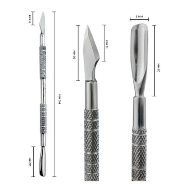 Лопатка SPL 9194 предназначена для предварительной подготовки кутикулы перед её удалением. Инструмент имеет круглый корпус и форму топорика (сокира) с одной стороны и вогнутую лопатку с другой. Рабочие части изготовлены из высококачественной нержавеющей стали, что обеспечивает долговечность, прочность и устойчивость к коррозии. Ручка выполнена из алюминия, что делает инструмент лёгким. Общая длина инструмента — 140 мм. Длина режущей части топорика — 14 мм, а длина режущей части лопатки — 20 мм при ширине 5 мм.