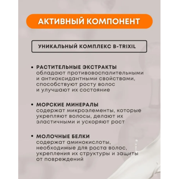 - Активные ингридиенты: B‑Trixil Complex, Растительные экстракты, Морские минералы, Молочные белки