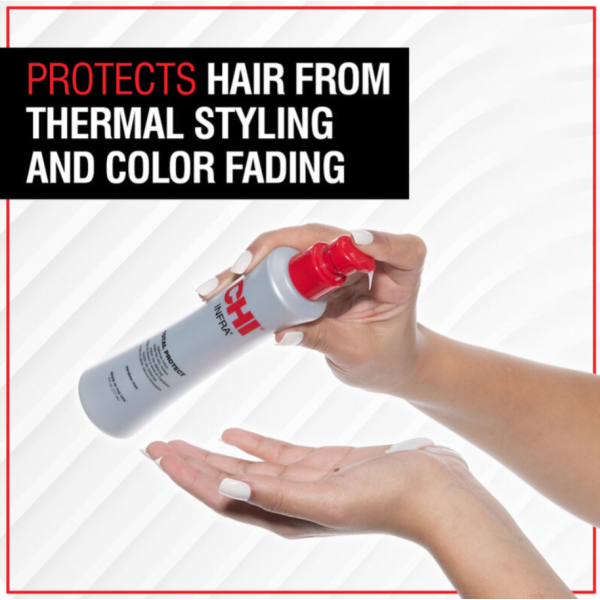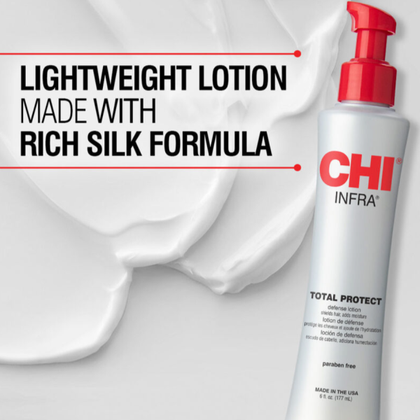 CHI Total Protect Infra — это профессиональный термозащитный лосьон для волос, созданный для защиты от высоких температур, УФ-лучей и механического повреждения при укладке. Формула с гидролизованным шёлком, витаминами, растительными экстрактами и силиконовыми компонентами образует лёгкую защитную вуаль вокруг волоса. Она удерживает влагу внутри, снижает повреждения от фена, утюжка и плойки, а также помогает сохранить цвет окрашенных волос. Средство одновременно работает как термозащита + лёгкий уход + разглаживающая база для укладки.