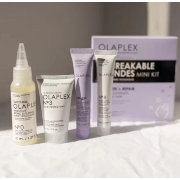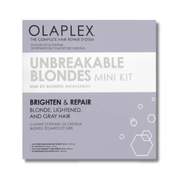 Olaplex Unbreakable Blondes Mini Kit — профессиональный мини-набор для интенсивного ухода за осветлёнными, окрашенными и седыми волосами. Средства, входящие в комплект, восстанавливают повреждённые связи внутри волоса, нейтрализуют нежелательную желтизну, придают блеск и упругость, а также защищают от ломкости и сухости. Идеален для поддержания холодного оттенка блонда и ухода за седыми волосами.