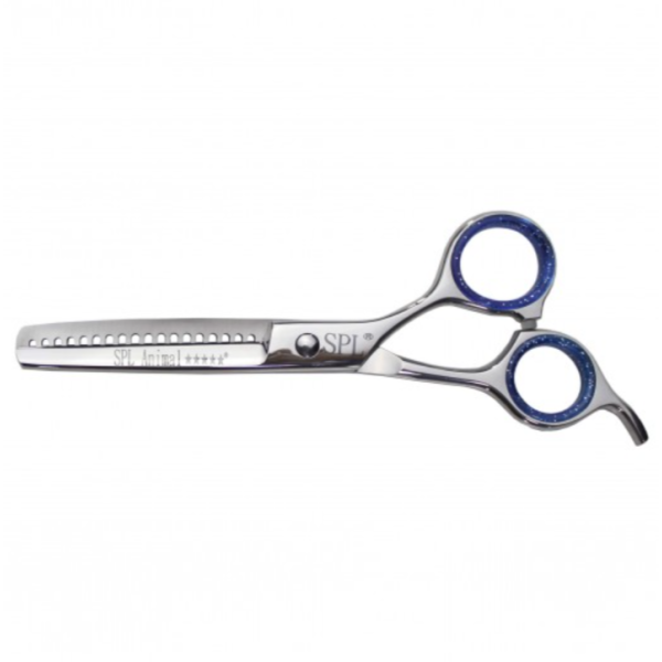 SPL 6.5″ финишные ножницы (арт. 90072-65) — профессиональный инструмент длиной 160 мм, предназначенный для финишной отделки шерсти у кошек и собак. Изготовлены из прочной медицинской стали, оснащены 18 зубцами, кольцами диаметром 20 мм с резиновыми вставками для комфортного хвата. Надёжные ножницы для регулярного использования в груминге.