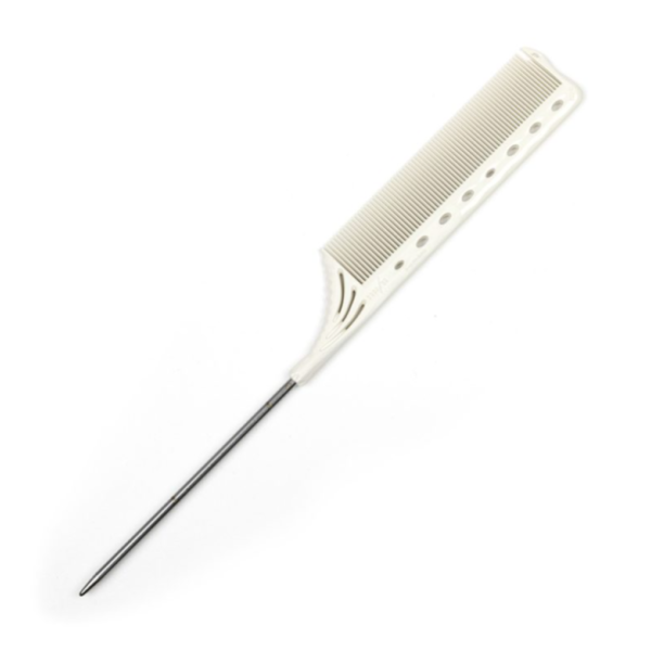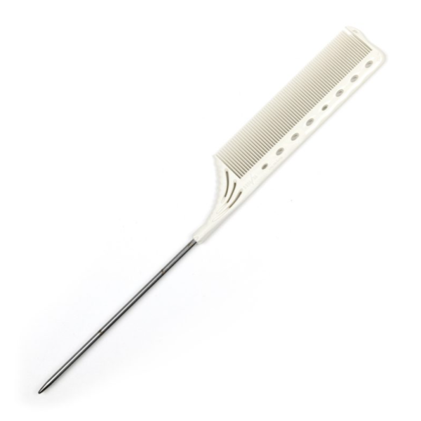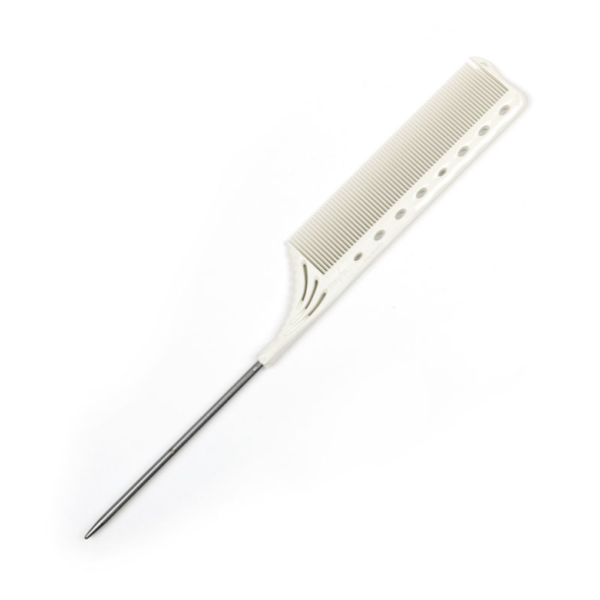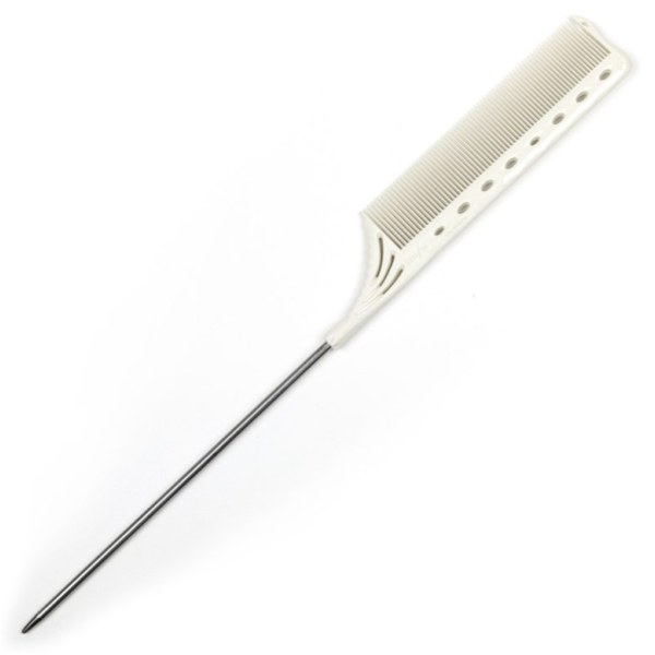 Y.S.Park YS-182 Tail Comb (White) — профессиональный инструмент, оснащённый полумелкими зубьями для плавного расчёсывания и толстым металлическим хвостиком (диаметр ~3 мм), который идеально подходит для быстрой и точной работы с волосами: начёса, фольгирования и прокрутки прядей.
