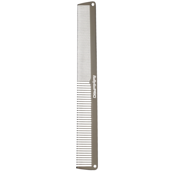 Расческа для волос Metal Comb BaByliss PRO — расчёска из нержавеющей стали длиной 19 см с устойчивым к износу гальваническим gunsteel‑покрытием, идеально подходит для точного стайлинга и клиппер‑контроля.