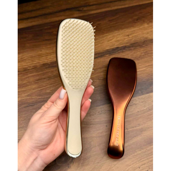 Щетка для волос The Ultimate Detangler Chrome Tangle Teezer — это профессиональная щетка-детанглер с ручкой, предназначенная для бережного распутывания волос без боли и повреждений. Оснащена фирменными двухуровневыми гибкими зубчиками, которые мягко скользят по волосам, уменьшают ломкость и делают их более гладкими и блестящими. Подходит для сухих и влажных волос, а также для распределения уходовых средств. Представлена в премиальных оттенках Neo Gold и Chocolate Bronze.