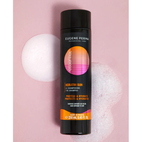 Eugène Perma Essentiel Keratin Sun Shampoo — деликатный шампунь, специально разработанный для волос, подвергающихся воздействию солнца, бассейна, морской или хлорированной воды. Он мягко удаляет остатки хлора, соли и песка, одновременно увлажняет, питает и защищает волосы, благодаря сочетанию растительного кератина и экстракта граната. Шампунь помогает сохранить мягкость, блеск, цвет и здоровье волос, даже при частом пребывании на солнце или в воде.