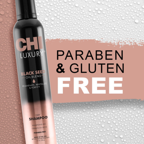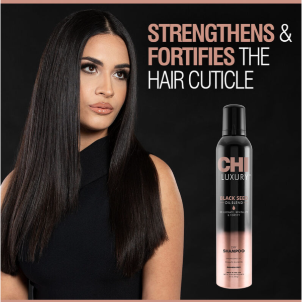 CHI Luxury Black Seed Oil Dry Shampoo — это профессиональный сухой шампунь-спрей, который мгновенно освежает волосы без использования воды. Формула с маслом чёрного тмина, рисовым крахмалом и витаминами A и E впитывает излишки себума у корней, устраняет ощущение жирности и придаёт волосам лёгкость и объём. Одновременно средство помогает поддерживать ухоженный вид волос между мытьём и продлевает стойкость укладки.