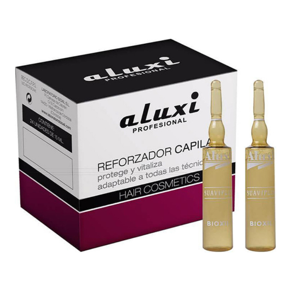 Професійні ампули Suaviplis Aluxi для пошкодженого та сухого волосся — інтенсивне живлення, зволоження та відновлення. Кожна ампула 15 мл повертає еластичність, силу, природний блиск і додатковий об’єм, розгладжує кутикулу та створює захисну плівку. Ідеальне експрес-відновлення для волосся, що постраждало від фарбування, термоприладів та зовнішніх факторів.