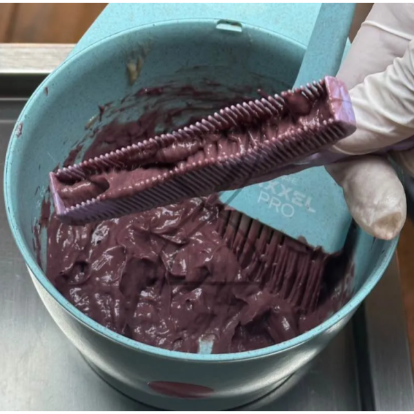 Y.S.Park YS-650 Double Tint Comb (фіолетовий) — компактний і продуманий інструмент довжиною 160 мм, вагою всього 29 г, виготовлений із міцного POM-пластика. Унікальна функція — самостійна конструкція, завдяки якій матеріали для фарбування не забруднюють робочу поверхню. Призначений для точного нанесення та розподілу барвника, особливо ефективний під час мелірування чи роботи з тонкими пасмами.