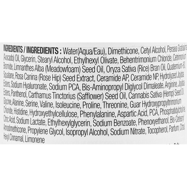 Aqua, Dimethicone, Cetyl alcohol, Persea Gratissima Oil, Glycerin, Stearyl Alcohol, Ethylhexyl olivate, Behentrimonium Chloride, Cetrimonium Bromide, Limnanthes Alba Seed Oil, Oryza sativa bran oil, Quaternium-80, Rosa canina seed extract, Ceramide AP, Ceramide NP, Hydrolyzed jojoba esters, Hyaluronic acid, Sodium PCA, Bis-aminopropyl diglycol dimaleate, Arginine, Cannabis sativa seed oil, Jojoba esters, Panthenol, Squalane, Carthamus Tinctorius Seed Oil, Glycine, Alanine, Serine, Valine, Isoleucine, Proline, Threonine, Guar Hydroxypropyltrimonium Chloride, Histidine, Hydroxyethylcellulose, Phenylalanine, Aspartic Acid, PCA, Phosphatidylcholine, Citric acid, Sodium Lactate, Ethylhexylglycerin, Sodium benzoate, Bis-cetearyl amodimethicone, Parfum, Citral, Hexyl cinnamal, Limonene.