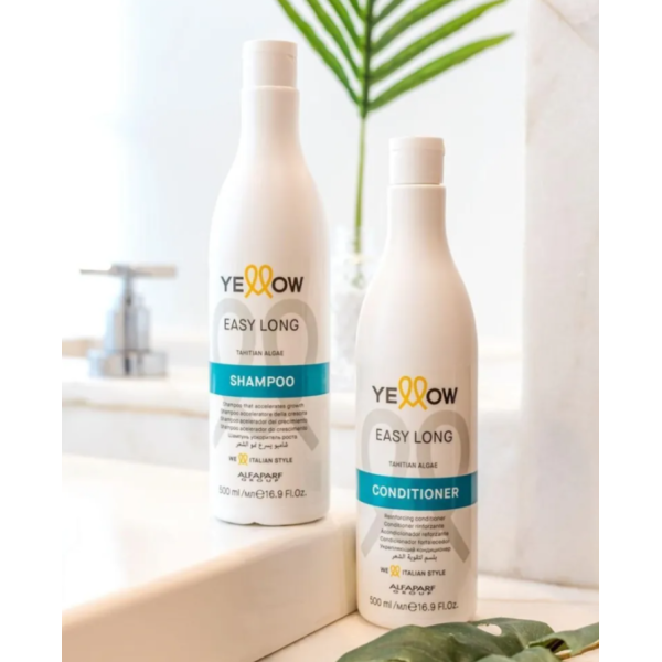Кондиціонер Easy Long від бренду Yellow Professional (500 мл) — зміцнювальний догляд-кондиціонер, що стимулює ріст волосся. Основу формули складають таїтянські морські водорості, багаті на мінерали, вітаміни, каротиноїди та поліненасичені жирні кислоти, які активують фолікули та сприяють прискоренню росту волосся. Кондиціонер полегшує розчісування, робить волосся м’яким та еластичним, зміцнює структуру від коренів до кінчиків.