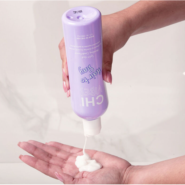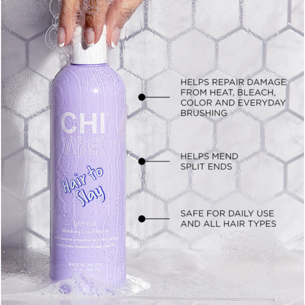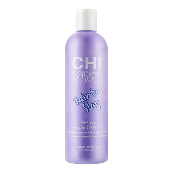 CHI Vibes Split-End Mending Conditioner (Hair to Slay) — це кондиціонер, спрямований на відновлення пошкоджених і посічених кінчиків волосся. Формула з скваланом, олією авокадо, пантенолом і амінокислотами допомагає зміцнювати волокно волосся, розгладжувати кутикулу та створювати захисний шар, який зменшує подальше розшарування кінчиків. Засіб не «склеює» волосся, а візуально покращує стан посічених кінців, роблячи їх більш гладкими та доглянутими.
