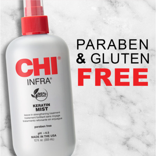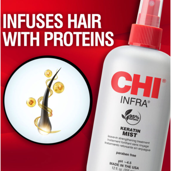 CHI Keratin Mist (Infra) — це легкий незмивний кондиціонер-спрей, який зміцнює волосся, покращує його структуру та захищає від пошкоджень. Формула з гідролізованим кератином, шовком, пантенолом і рослинними екстрактами проникає в структуру волосся, вирівнює пористість і підвищує еластичність. Завдяки технології Cationic Hydration Interlink, активні компоненти краще закріплюються у волоссі, забезпечуючи тривале зволоження та захист. Це один із найуніверсальніших leave-in засобів CHI: він не обтяжує волосся, але помітно покращує його зовнішній вигляд і керованість.