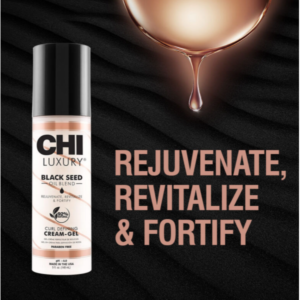 CHI Luxury Black Seed Oil Curl Defining Cream-Gel — це професійний крем-гель для формування локонів, який поєднує догляд і легку фіксацію для створення чітких, пружних кучерів. Формула з олією чорного кмину живить і зміцнює волосся, допомагає контролювати пухнастість і надає локонам природний блиск. Засіб м’яко фіксує форму, не створюючи ефекту «жорсткого волосся», і зберігає рухливість укладки. Ідеально підходить для створення як природних хвиль, так і більш структурованих кучерів.