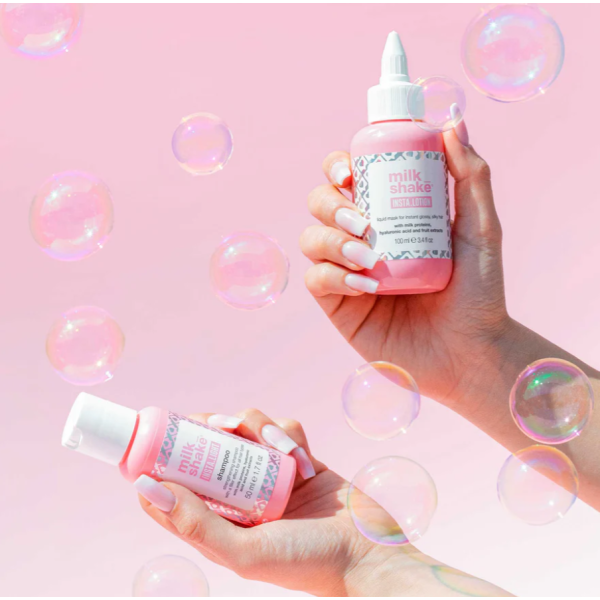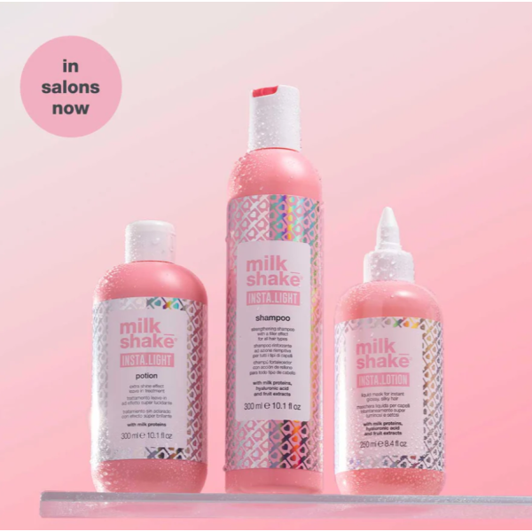 Milk Shake Insta.light Lotion — надлегкий rinse-out лосьйон, який перетворює волосся на "glass hair" - гладке, блискуче і полегшує укладання. Всього за кілька секунд він розгладжує кутикулу, підвищує зволоженість і прискорює сушіння.