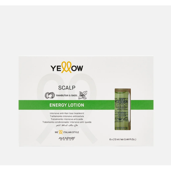 Лосьйон Yellow Professional Scalp Energy Lotion 6×13 мл — професійний засіб для зміцнення та стимулювання росту волосся. Формула з охолоджувальним ефектом активізує мікроциркуляцію, насичує шкіру голови енергією та поживними речовинами. Активні рослинні екстракти зміцнюють корені, запобігають випадінню та подовжують життєвий цикл волосини. Підходить для всіх типів волосся, включно з ослабленими. Ідеальний для курсового застосування або як профілактичний догляд.
