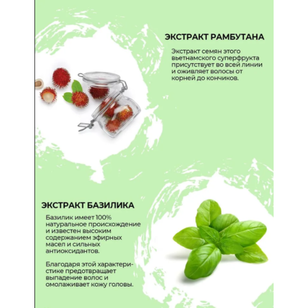 - активні інгредієнти: Екстракт рамбутану, екстракт базиліку, гідролізований пшеничний протеїн, алое вера