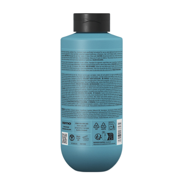 Маска для нейтралізації мідних відтінків волосся Super Cool New Osmo 400 мл — професійний засіб, призначений для усунення небажаних теплих, мідних тонів та підтримки холодного відтінку волосся. Засіб містить фіолетові та сині пігменти, які ефективно нейтралізують мідні та теплі відтінки, роблячи колір більш рівним та холодним. Формула також включає живильні компоненти та зволожуючі екстракти, що сприяють зміцненню структури волосся, інтенсивному зволоженню та м’якості локонів.