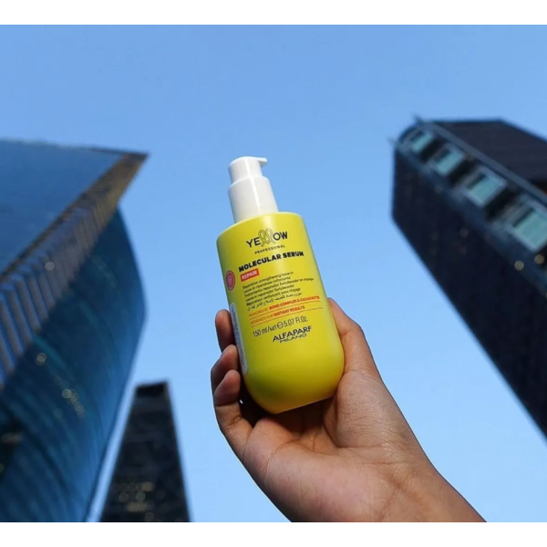 Yellow Professional Molecular Serum Repair 150 мл — несмивна молекулярна сироватка для відновлення пошкодженого волосся. Містить інноваційний BOND Complex, який відновлює молекулярну структуру волосся, зміцнює його зсередини та запобігає подальшим пошкодженням. Арганова та какао олії у складі живлять і надають блиск, покращуючи еластичність та м’якість волосся.