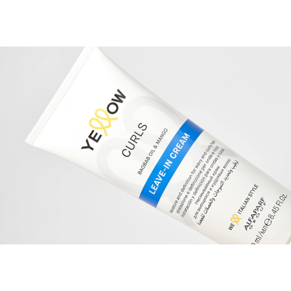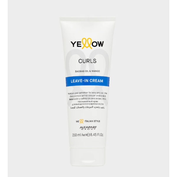 Yellow Curls Leave-In Cream 250 мл — легкий незмивний крем-догляд для хвилястого та кучерявого волосся. Засіб зволожує, контролює пухнастість, формує локони та захищає від термічного впливу фена. Формула на основі олії баобаба та манго надає волоссю м’якість і еластичність без обтяження.