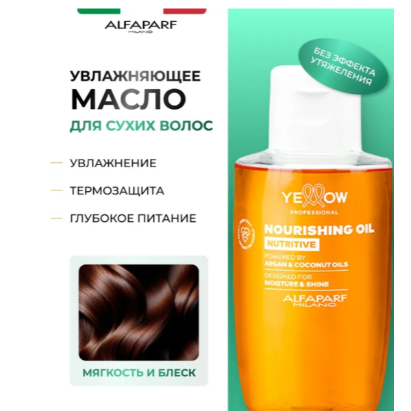 Yellow Professional Nourishing Oil 100 мл — незмивна поживна олія для сухого та ослабленого волосся. Містить Aloetrix — комплекс з алое вера, пшеничного протеїну та УФ-фільтру, який зволожує, полегшує розчісування та захищає волосся від зовнішніх впливів. Арганова та кокосова олії живлять і відновлюють структуру волосся, надаючи їм життєву силу та шовковистість.