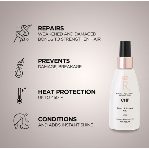 CHI Bond Repair Royal Treatment Oil 118 мл — це професійна олія, розроблена для відновлення та зміцнення внутрішніх зв’язків волосся (bond-структури), які пошкоджуються під час фарбування, освітлення та термоукладання. Формула глибоко проникає у структуру волосся, допомагаючи відновити міцність, зменшити ламкість і покращити еластичність, роблячи волосся більш стійким до зовнішніх пошкоджень і щоденних навантажень.