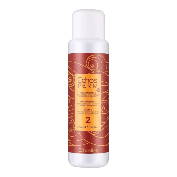Рідина для хімічної завивки Echosline Perm P2 500 мл — це професійний засіб для перманентної завивки фарбованого, пошкодженого та хімічно обробленого волосся. Продукт забезпечує стійкі, пружні та чіткі локони, зберігаючи при цьому структуру волосся та мінімізуючи пошкодження. Формула збагачена рослинними екстрактами (кропива, шавлія, деревій, розмарин) і органічним екстрактом каштану, які допомагають зволожувати, захищати та відновлювати волосся під час процедури.