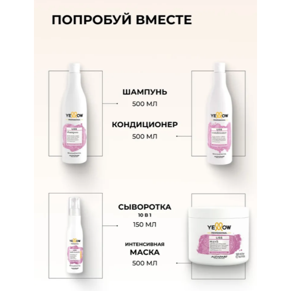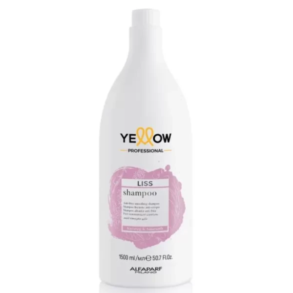 Yellow Professional Liss Shampoo — професійний шампунь для неслухняного, кучерявого або схильного до пухнастості волосся. Формула з високотехнологічним кератином Keratin-HT та олією амаранту ефективно очищає волосся, забезпечує ефект anti-frizz і допомагає вирівняти навіть найкапризніші пасма. Засіб підходить для регулярного використання та полегшує контроль над волоссям навіть за підвищеної вологості.