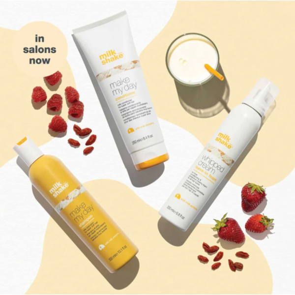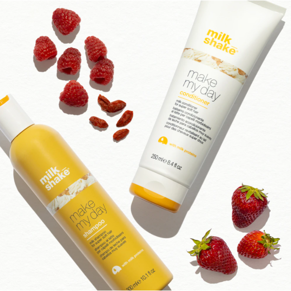 Make My Day Shampoo Milk Shake — обволікаючий крем-шампунь з молочними протеїнами, ягідними екстрактами (геджі, полуниця, малина) та солодким ванільним ароматом. Він ніжно очищає, зміцнює та кондиціонує волосся, надаючи їм м'якість, блиск та приємне відчуття після кожного застосування. Формат підходить для всіх типів волосся і особливо цінується тими, хто хоче поєднувати догляд та запашний заряд енергії на кожен день.