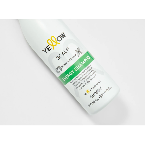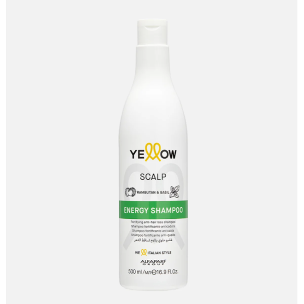 Yellow Professional Scalp Energy Shampoo 500 мл — професійна формула для волосся, схильного до випадіння та ослабленого. Шампунь глибоко очищає шкіру голови та стимулює волосся «з нуля», посилюючи об’єм і густину, забезпечуючи ефект бадьорості та здоров’я. Містить екстракт рамбутану та базиліку, які підтримують волосся і шкіру голови. Підходить як для домашнього, так і для салонного використання.