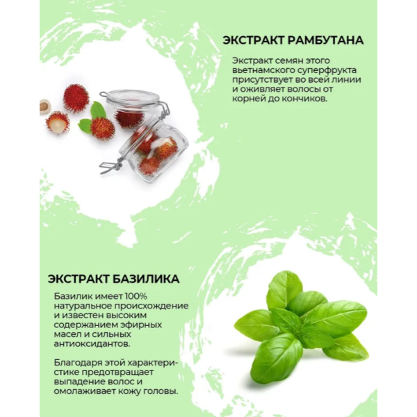 - Містить активні компоненти на основі натуральних інгредієнтів (рамбутан, базилік) для підтримки здоров’я волосся