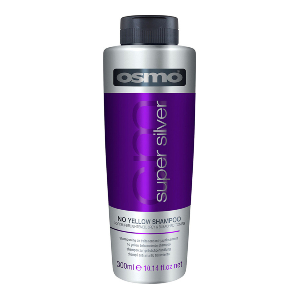 Шампунь проти жовтизни для знебарвленого та сивого волосся Super Silver від Osmo, 300 мл — професійний засіб для догляду за блондом, сивим та знебарвленим волоссям. Формула шампуню містить насичений фіолетовий пігмент, який ефективно нейтралізує небажані жовті та мідні відтінки, повертаючи волоссю холодний платиновий або сріблястий тон. Він м’яко очищає волосся, живить його та надає гладкість і доглянутий блиск, при цьому не містить сульфатів. Засіб підходить як для ослабленого після знебарвлення волосся, так і для сивого, допомагаючи підтримувати свіжий та чистий колір.