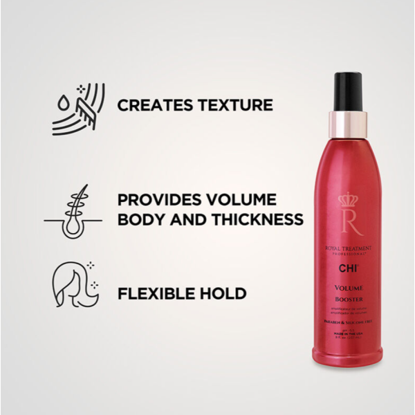 CHI Volume Booster Royal Treatment Spray 237 мл — це професійний прикореневий спрей, який створює виражений об’єм, щільність та текстуру волосся, особливо у зоні коренів, надаючи укладці легкість, живість та стійкість. Легка формула швидко розподіляється і не обтяжує волосся, дозволяючи досягти об’єму від коренів до кінчиків без ефекту склеювання. Унікальна текстура робить волосся більш пружним, а стиль — стійким і доглянутим, що особливо важливо для тонкого, рідкого або плоского волосся.