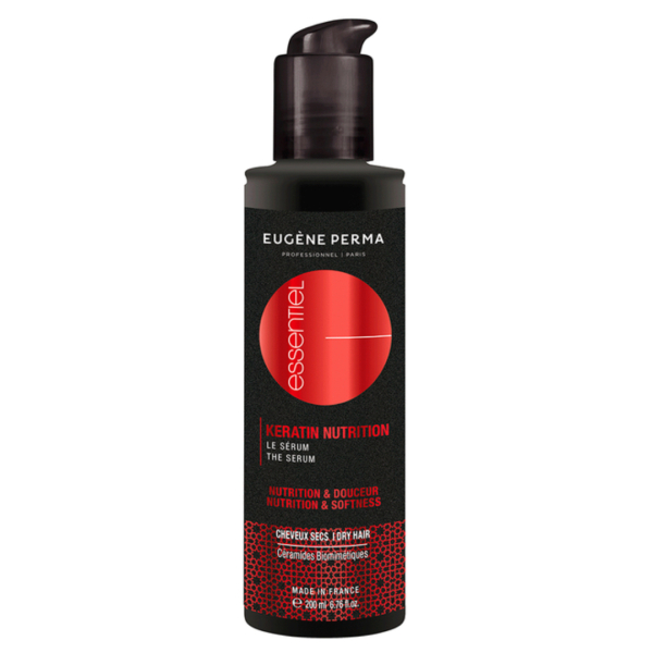 Eugène Perma Essentiel Keratin Nutrition Serum — легка незмивна сироватка-догляд з кератином та біоміметичними керамідами, призначена для сухого, ламкого та пошкодженого волосся. Засіб глибоко живить, відновлює структуру волосся, захищає від ламкості, робить пасма м’якими, еластичними, гладкими та шовковистими. Сироватка полегшує розчісування, надає блиск і доглянутий вигляд, не обтяжуючи волосся.