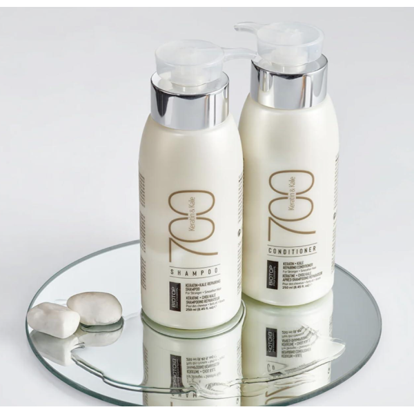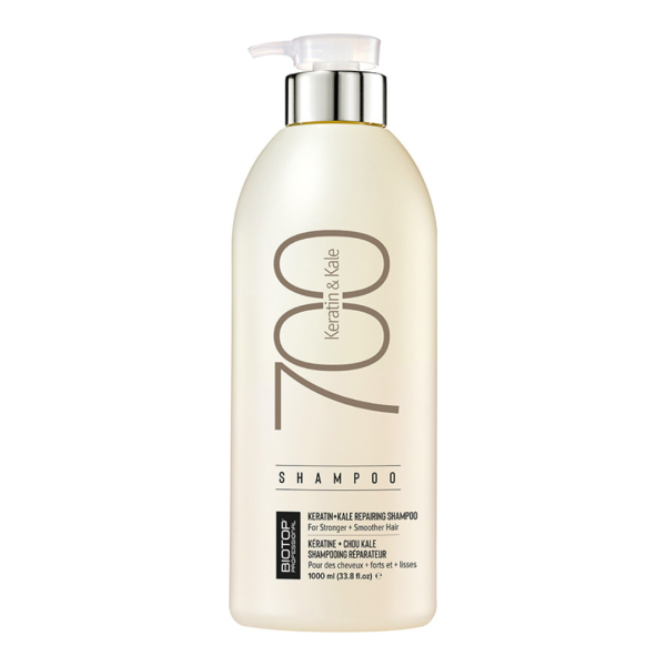 Шампунь для волосся Keratin + Kale 700 Biotop — професійний засіб для очищення та глибокого відновлення волосся, збагачений гідролізованим кератином і екстрактом капусти (kale). Він м’яко очищає шкіру голови та довжину, зміцнює й розгладжує пошкоджені пасма, допомагає зменшити ламкість і пухнастість, а також робить волосся більш м’яким, сильним і блискучим.
