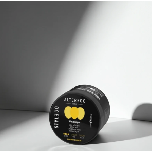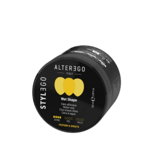 Віск Stylego Wet Shape від Alter Ego Italy — це прозорий віск на водній основі, який створює ефект “мокрого волосся” (wet look) з сильним глянцем і при цьому не обтяжує зачіску. Підходить як для нанесення на вологе волосся для виразної, глянцевої укладки, так і на сухе волосся, щоб додати блиску та еластичності.